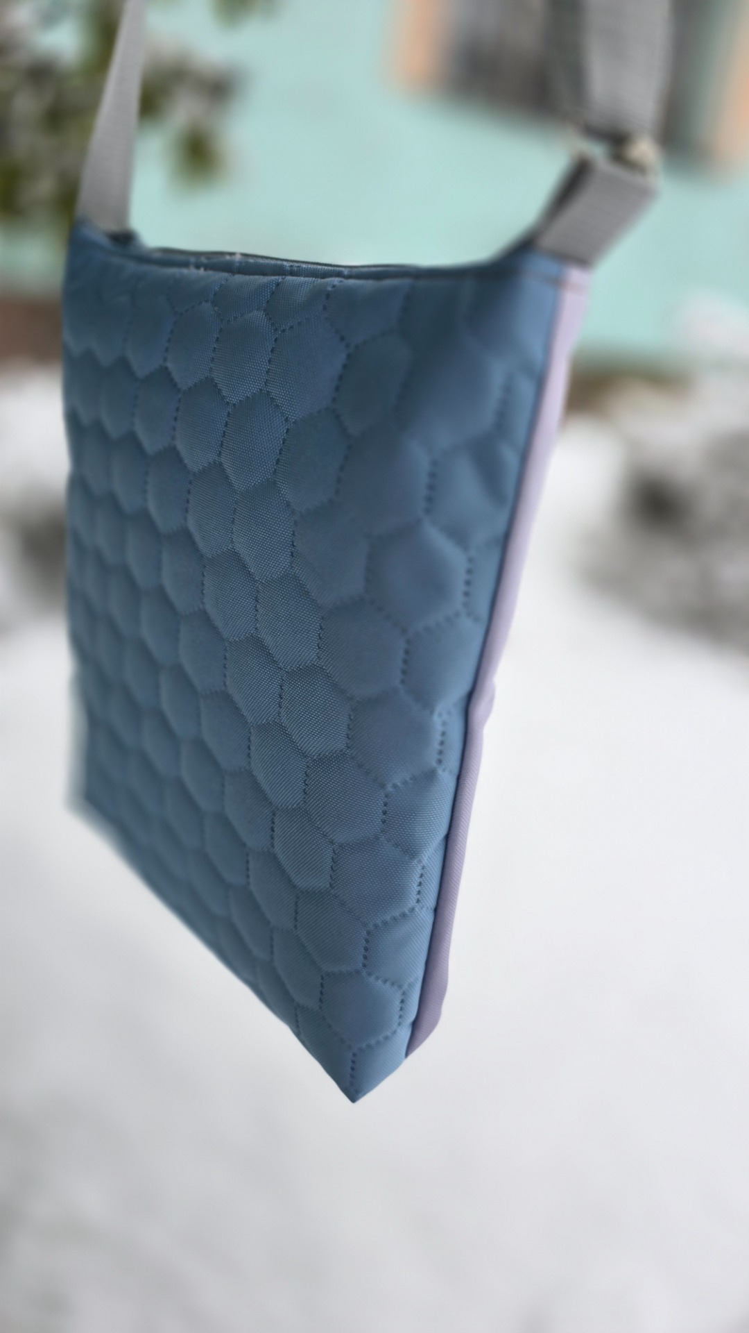Ručně šitá kabelka na zip, přes rameno. Pevná kabelka s nastavitelnou délkou popruhu. Uvnitř 2 kapsy. Motiv je zepředu, zezadu je světle modrá látka.