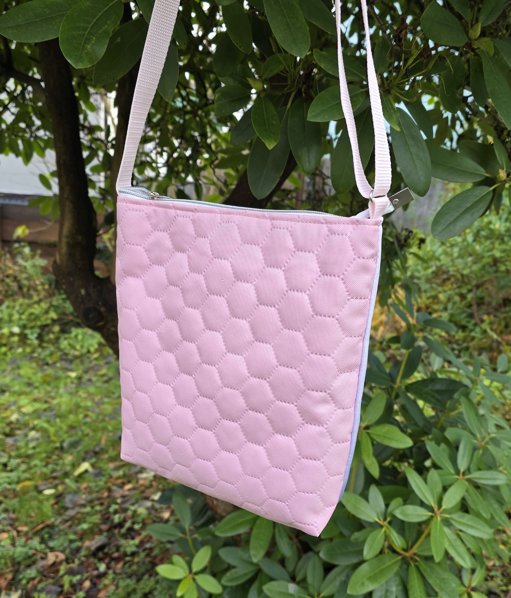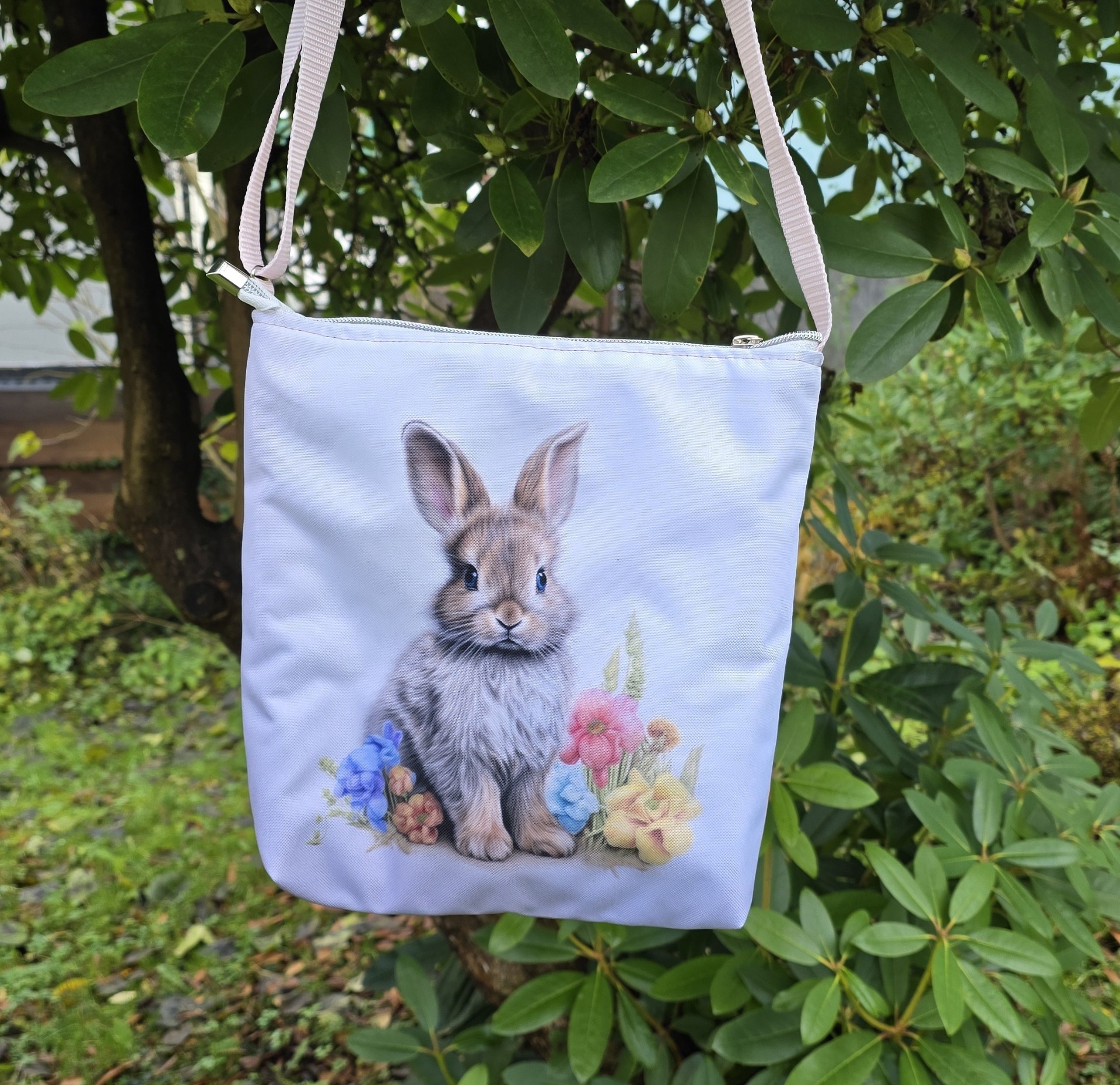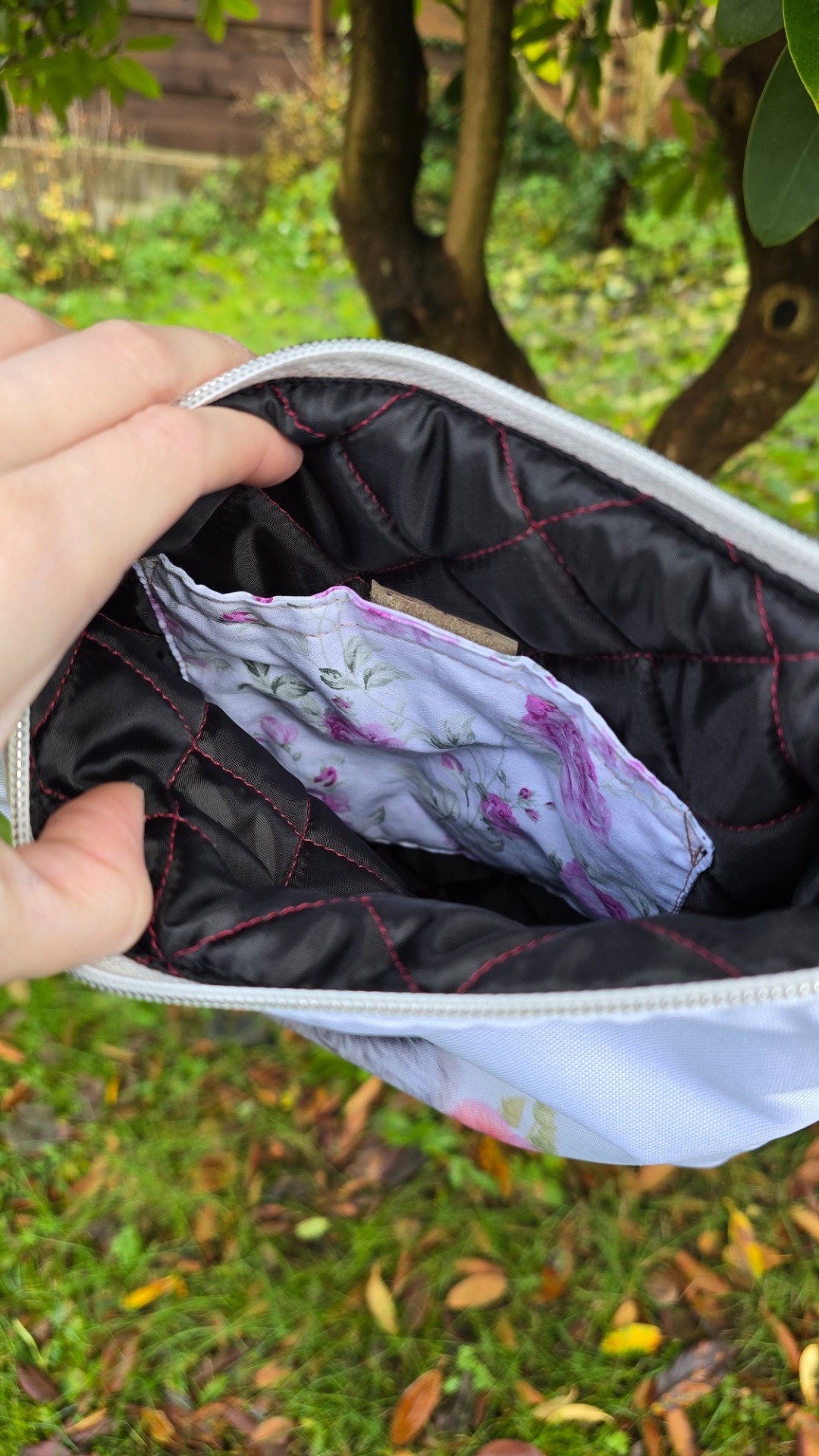 Ručně šitá kabelka na zip, přes rameno. Pevná kabelka s nastavitelnou délkou popruhu. Uvnitř 2 kapsy. Motiv je zepředu, zezadu je růžová látka.