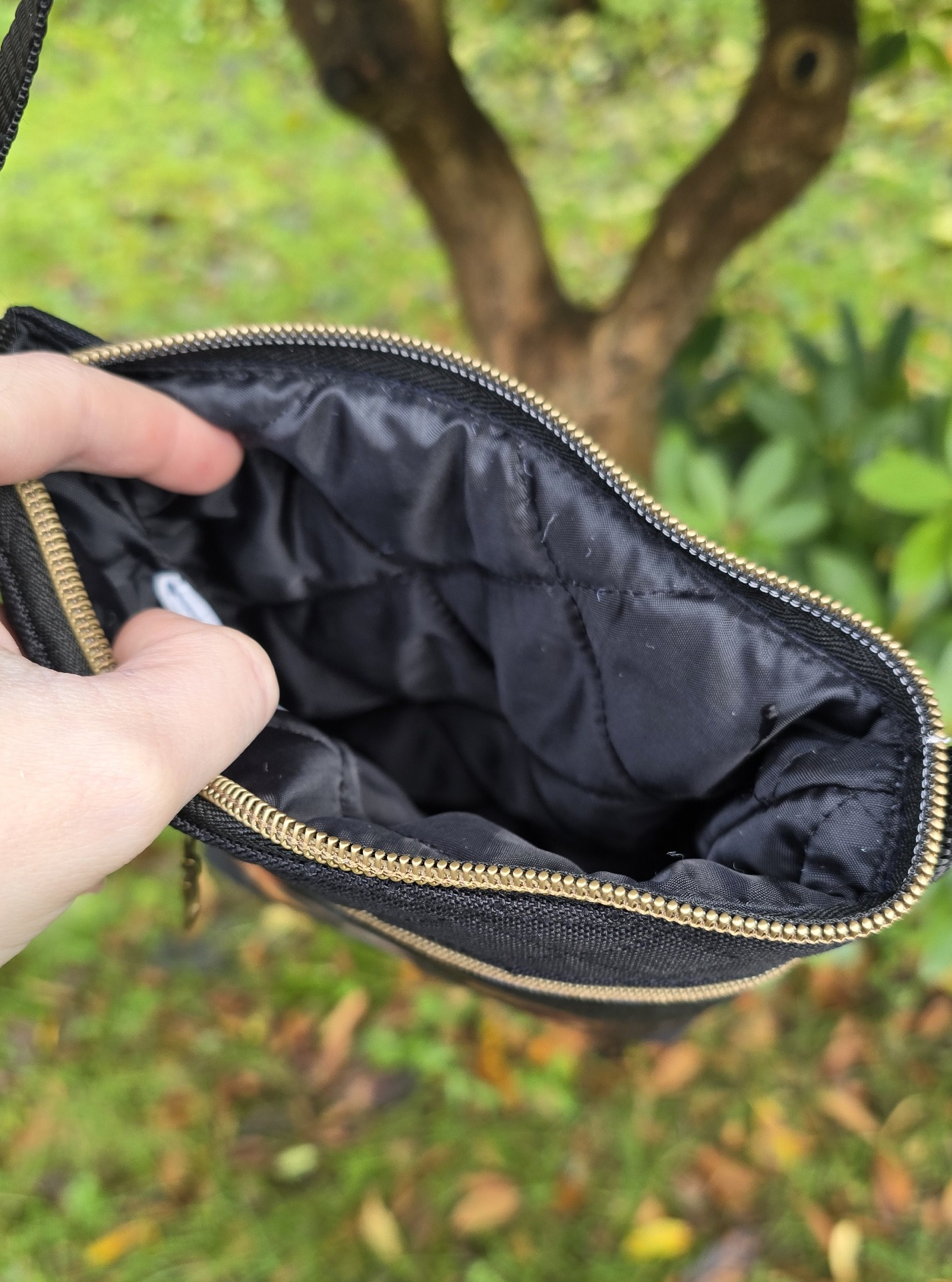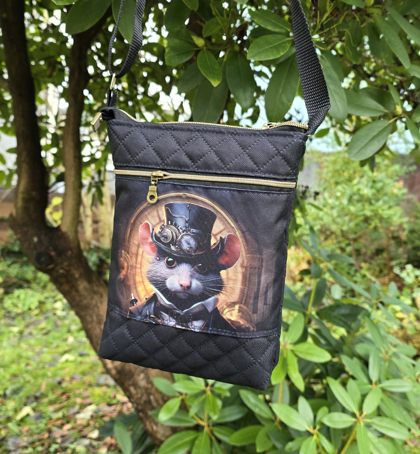 Ručně šitá kabelka na zip, přes rameno. Pevná kabelka s nastavitelnou délkou popruhu. Uvnitř 1 kapsa z venku 1 kapsa. Motiv je zepředu, zezadu je černá látka.