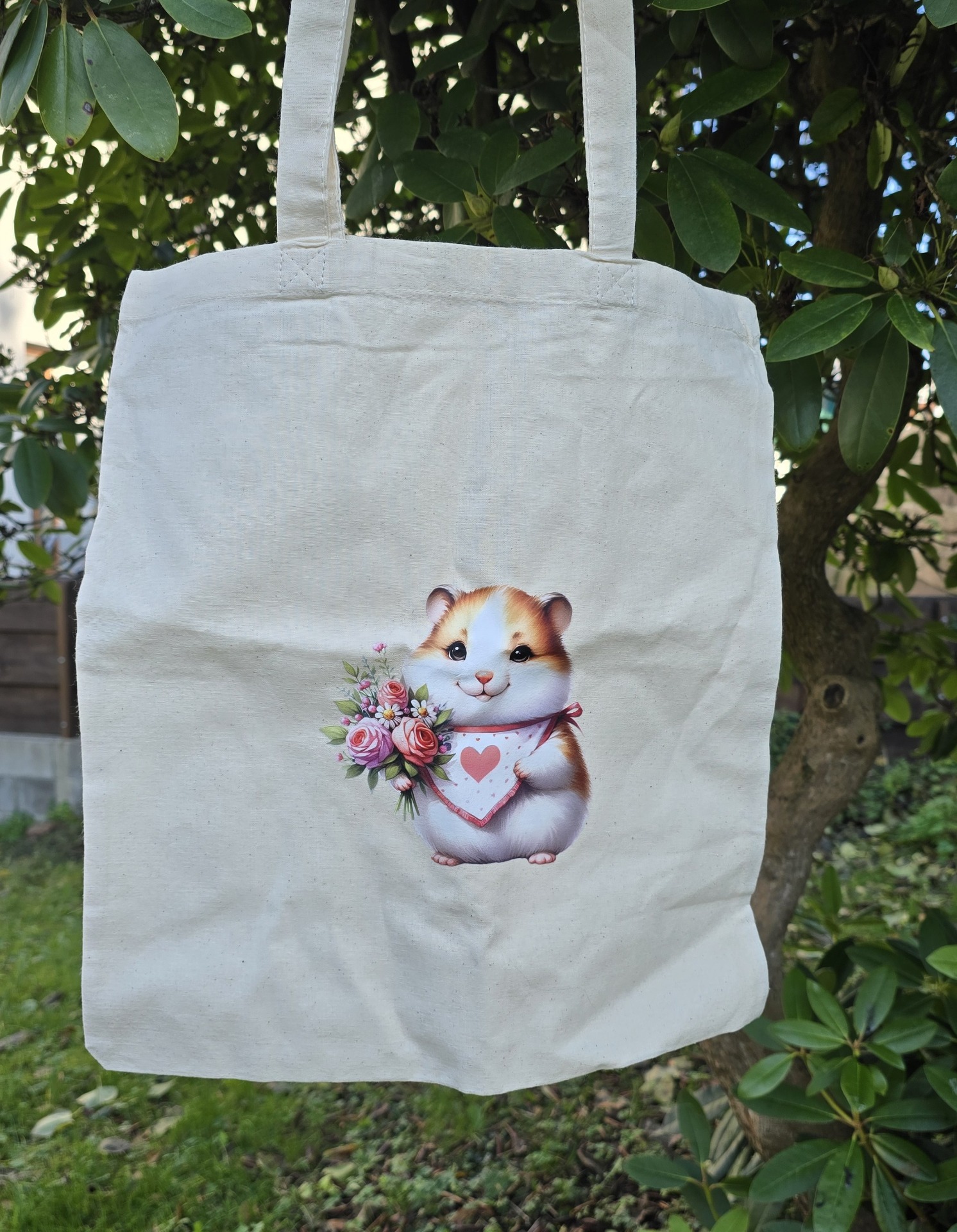 Látková taška přírodní barvy s nažehlovačkou křečka s květinou.