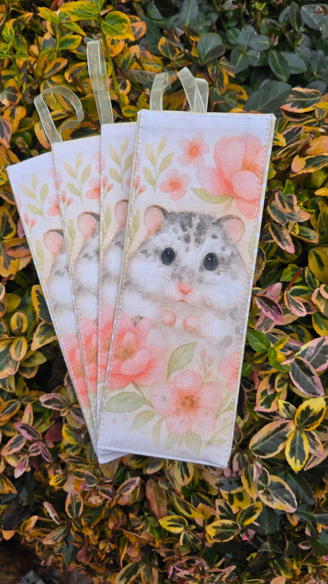 Látková, ručně šitá záložka do knihy s motivem křečíka Campbellova. Zadní strana béžová s bílými puntíky.