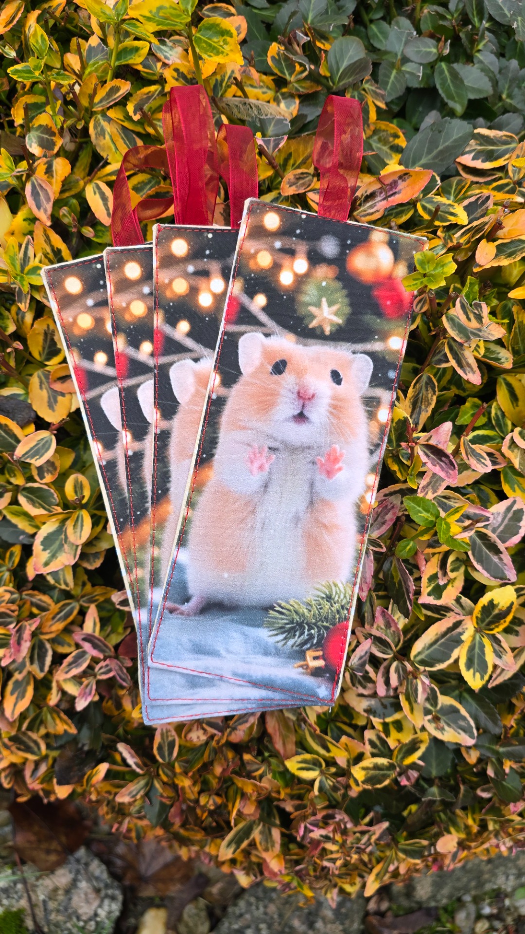 Látková, ručně šitá záložka do knihy s motivem vánočním křečkem. Zadní strana béžová s bílými puntíky.